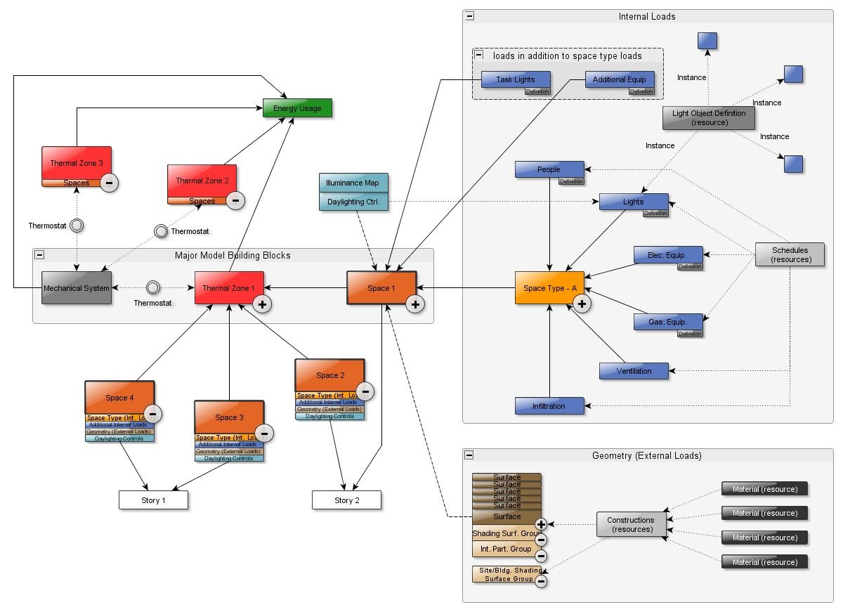 The diagram below shows an early version of the OpenStudio Model Objects Hierarchical Relationships. This is not a comprehensive diagram, but rather focuses on the building envelope (external loads) and building activity (internal loads). It is a good reference to understand where objects reside in the model, and what other objects they impact and are impacted by.