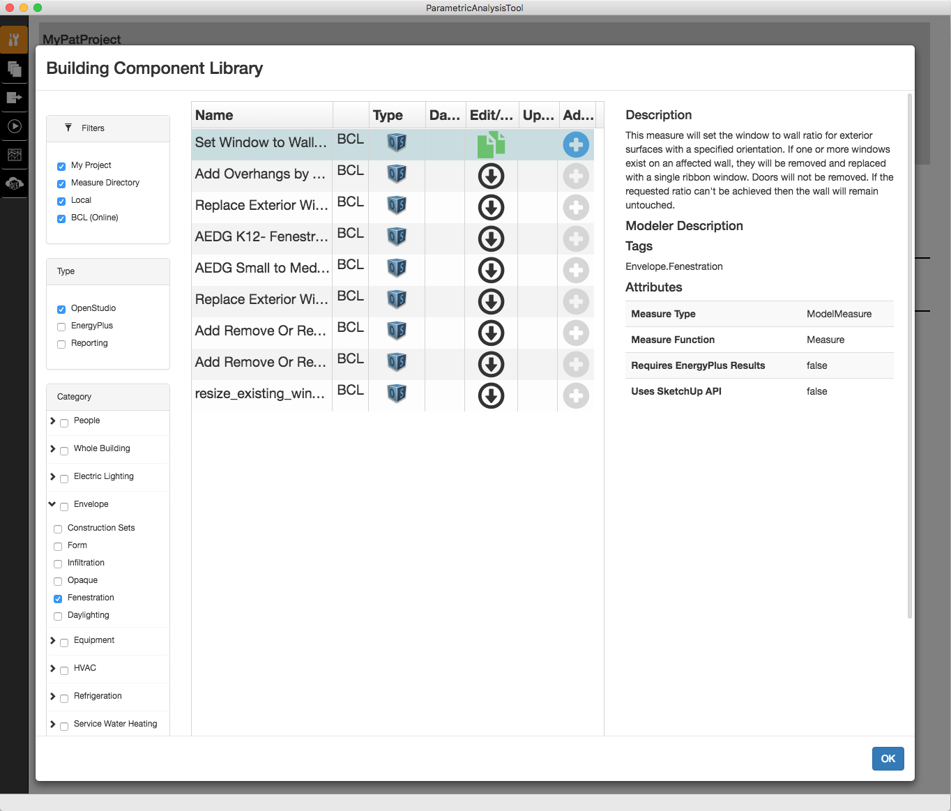 Above: Filtered View showing Online BCL OpenStudio Fenestration measures. The "Set Window to Wall Ratio" measure has been downloaded from the BCL but not yet added to the project.