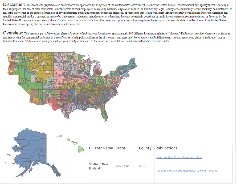 The geographic clusters are formed on a county basis and depend on building type, age, and climate. Adjacent counties with similar commercial densities, types, and age distributions form a cluster. Clusters form regional groups if they belong to the same American Society of Heating, Refrigerating and Air-Conditioning Engineers (ASHRAE) climate zone. See the technical reference documentation for more detail on the clustering method.