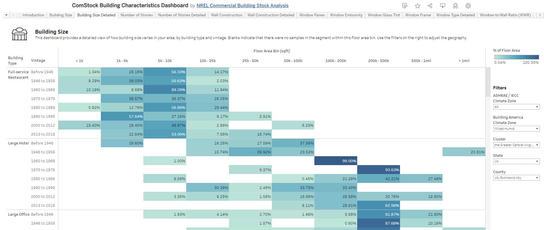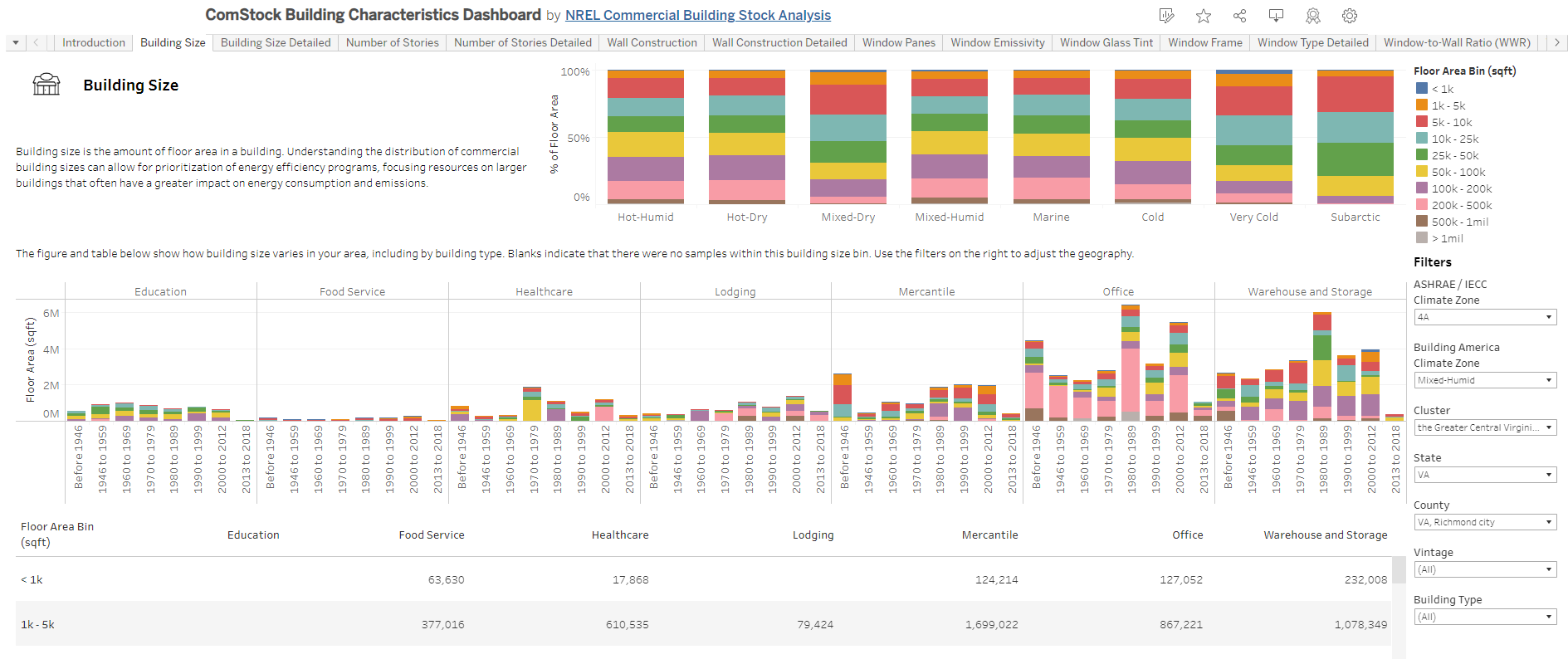 - Visit the ComStock Building Characteristics Dashboard on the ComStock Tableau public page.
