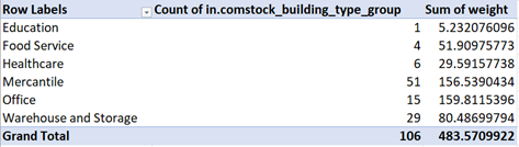 Take note of the Sum of weight value for the building type groups with less than 5 samples (“Education” and “Food Service”).