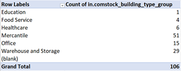 Drag the field in.comstock_building_type_group into the “Rows” and “Values” sections in the PivotTable Fields sidebar on the right. This will show how many samples of each building type group are in your area of interest.