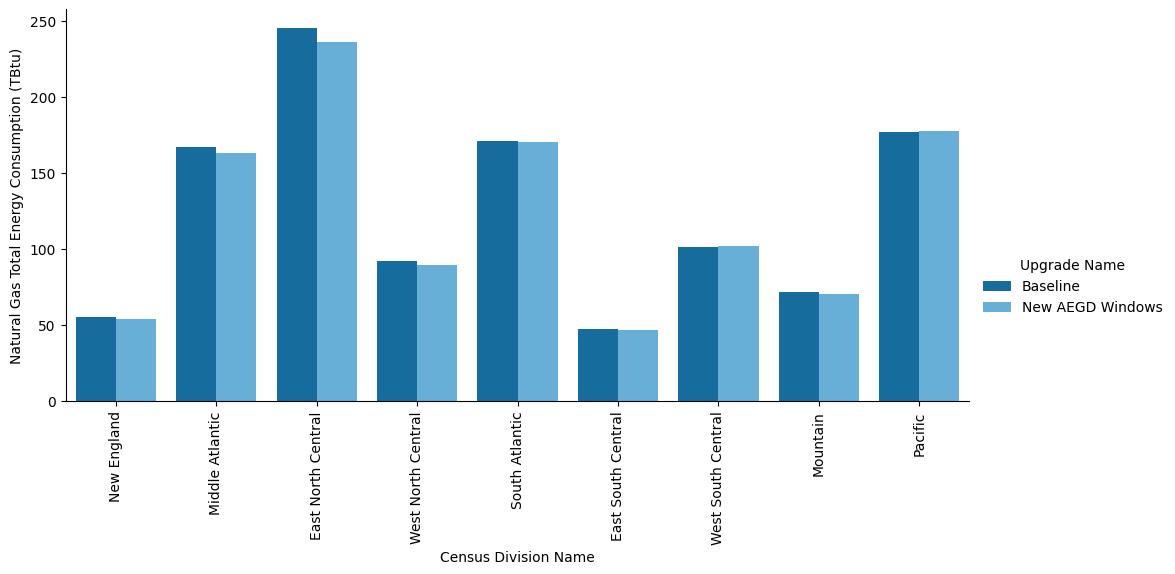 Figure A-4. Site annual natural gas consumption of the ComStock baseline and the window replacement scenario by census division