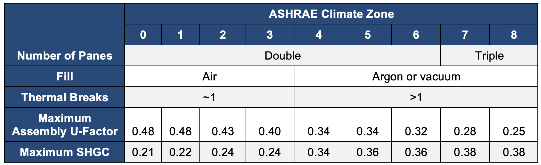 A thermal break is often used to insulate the frame and reduce the U-value. The glazing in commercial windows can be single, double, or triple pane, with each generally increasing the U-value of the window [2]. Single pane is very prevalent in the actual stock as well as the ComStock baseline, but this type of glazing has a higher U-value and is not usually permissible in modern energy codes. Double pane glazing is usually a good option for most climate zones, as it provides a good balance of U-value (~0.35 assembly) and cost [2]. Triple pane has the lowest U-value; however, the added cost makes it very expensive. Therefore, it is generally only considered in cold climates or in cases where thermal performance is a priority. The glazing fill can also contribute to the realized assembly U-value, with options generally being air, argon, or vacuum. Vacuum is used to achieve very low U-values [2]. For SHGC, many glazing products offer various tints to reasonably achieve the desired SHGC of any energy code. Lower SHGC and visual light transmittance (VLT) products will protect against heat gain to the space and glare to some degree. If the SHGC is too low, however, it can block beneficial heat gain in the winter months, which could reduce heating energy. SHGC is therefore recommended by climate zone to balance cooling and heating benefits.