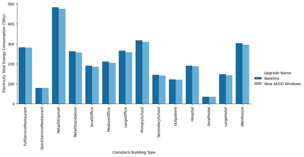 Figure A-1. Site annual electricity consumption of the ComStock baseline and the window replacement scenario by building type