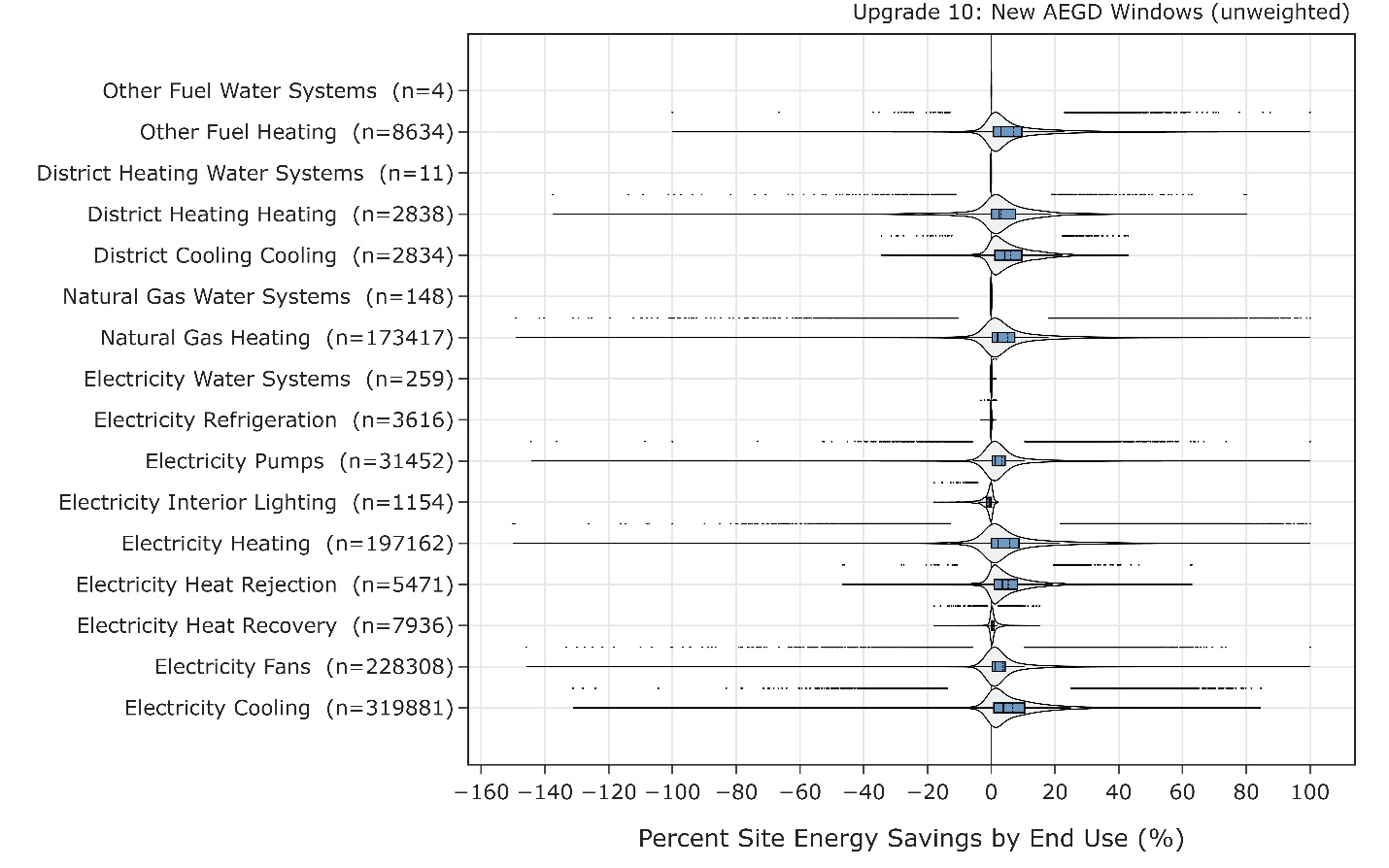 Figure 5 shows the percent savings distribution for each end use and fuel type combination between the baseline ComStock model and the corresponding upgrade model. Models are included in these distributions only if they experienced savings (or a penalty) for the specific distribution. The model count for the distributions is indicated in each distribution title. Many end uses demonstrated a wide range of savings.