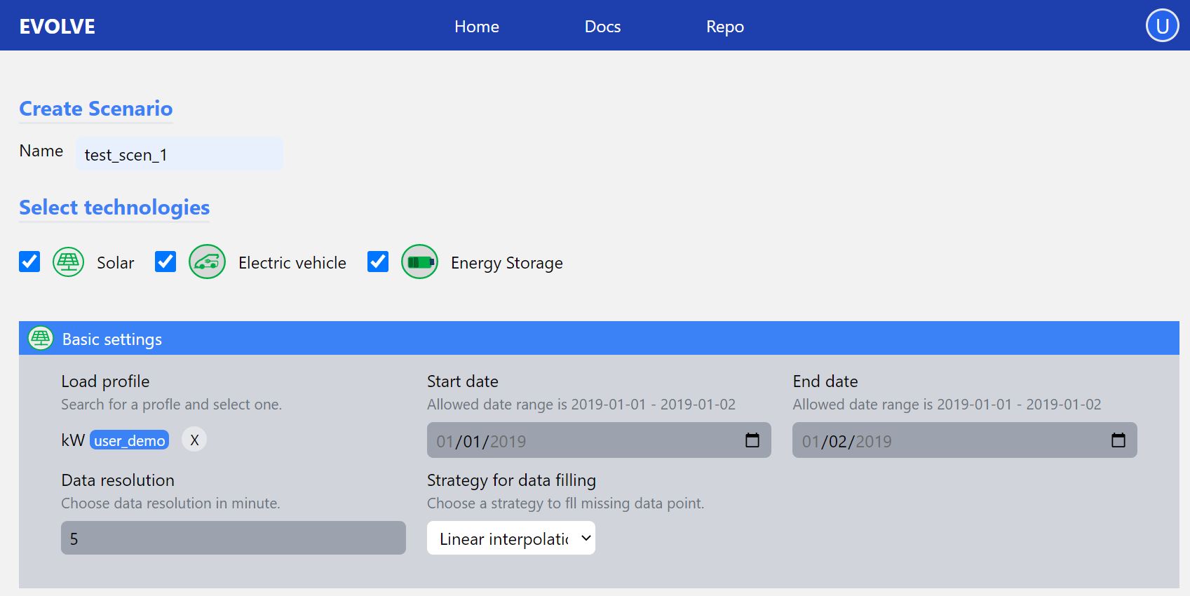 The user should pick a name for their scenario and select the desired technologies they wish to model. The Basic Settings window is for adding information regarding the circuit's load profile. Select the load profile, a start and end date, and a data resolution. Note: if the user selects a data resolution that is smaller than that of the selected load profile, one will need to also select the data filling strategy.