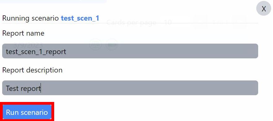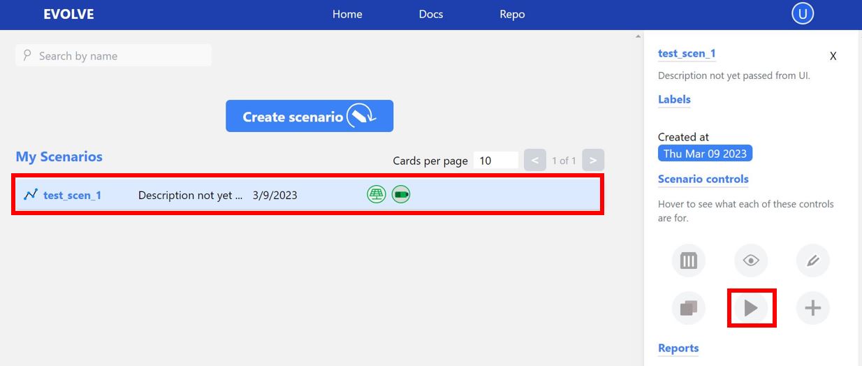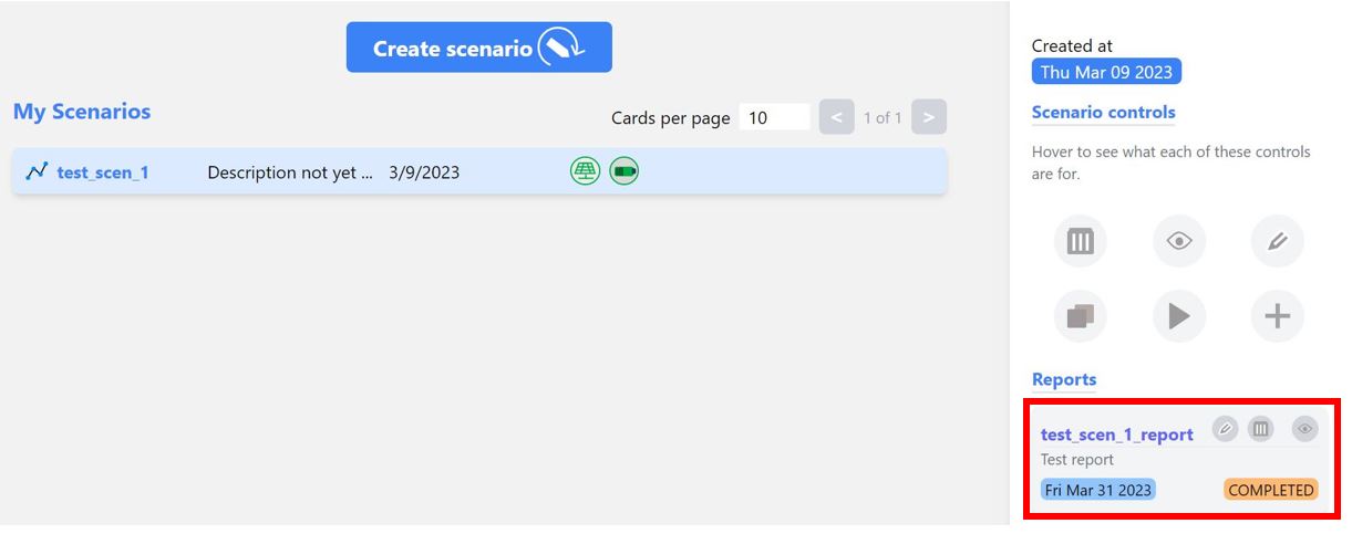 To run a scenario, click on the scenario and then select the grey play button on the right tool bar. One will be prompted to name the report and add a description. Once can also use this toolbar to delete, view, edit, or clone a given scenario as well as view any reports.