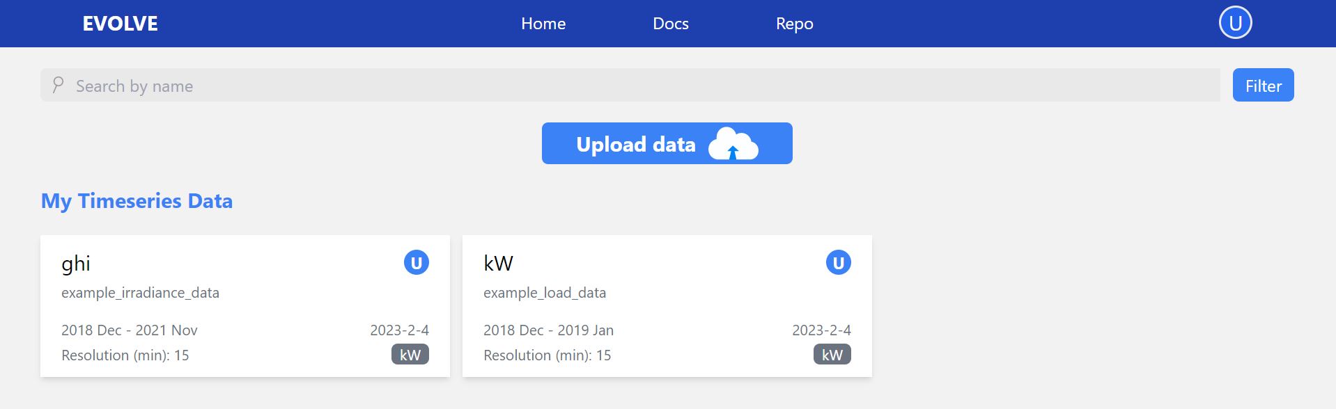The Manage Your Data tab is where the user will upload and manage timeseries data for load and/or irradiance values.