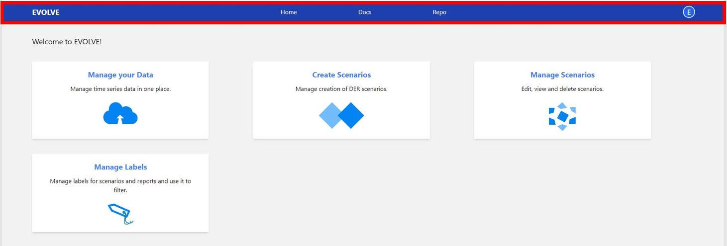 The homepage has several main features, explained in detail below. 1. Toolbar 2. Manage Your Data 3. Create Scenarios 4. Manage Scenarios 5. Manage Labels