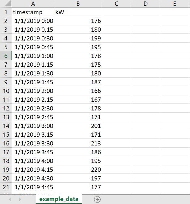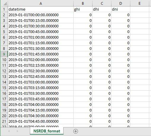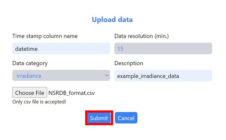 The user must first have a csv file prepared with the desired data to upload. The csv file should have two columns: a timestamp and the kw or irradiance values. The example below shows both types of data in the correct format for use in EVOLVE. The user must fill out the required fields, select the desired csv file, and click the blue Submit button.