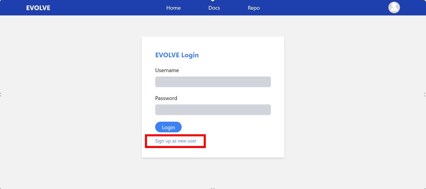 After you open a browser window and type http://localhost:5001 in the adress bar, you will be directed to the Evolve Login Page. Select the Sign up as new user link. Fill out a username, passwork, and email address. Once your account is created, the user can login and will be directed to the EVOLVE home page.