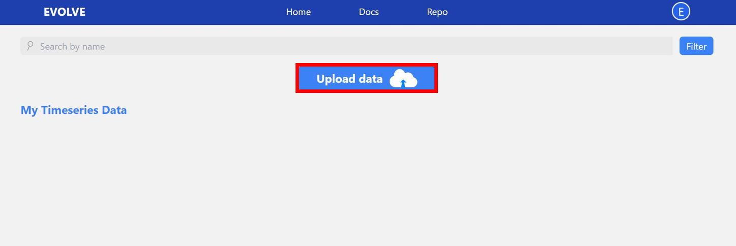 The page will initially be blank until the user has uploaded datasets. To do so, first click on the blue Upload Data button.