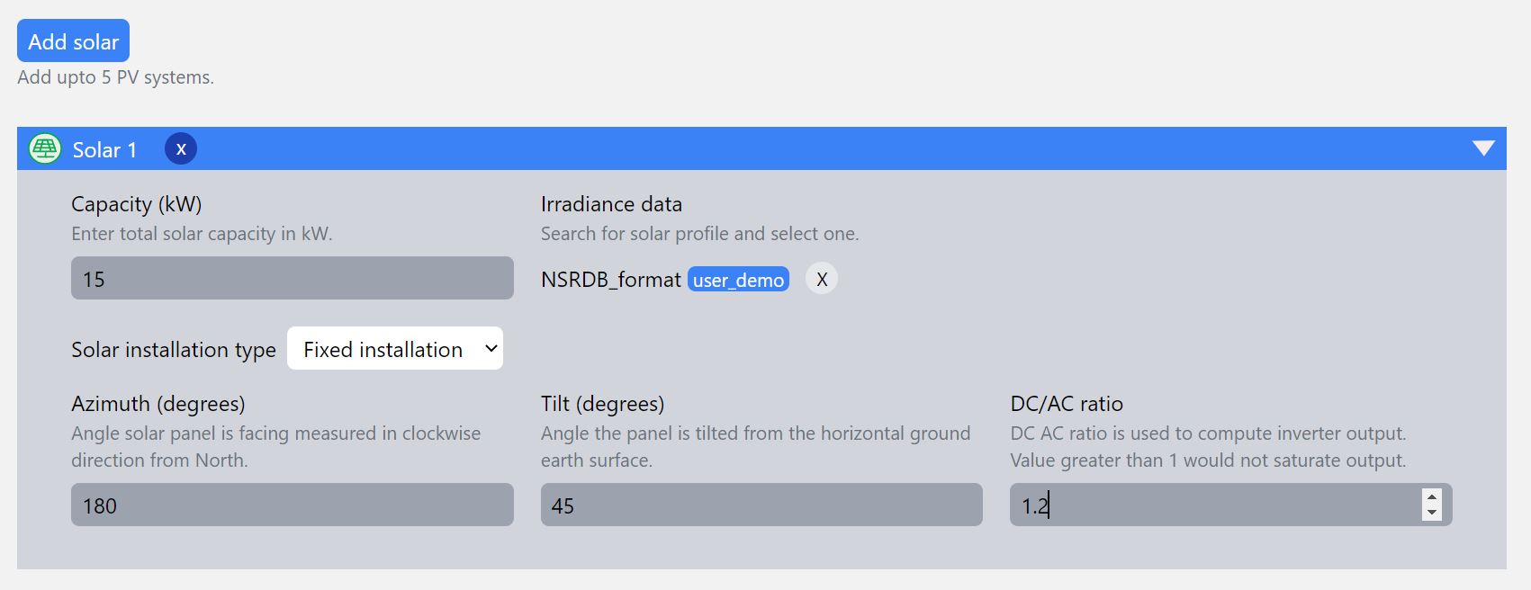For the selected technologies, fill out the required fields. One can add additional solar, EV, or energy storage systems (up to 5) using the blue button above each technology window.