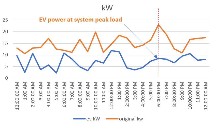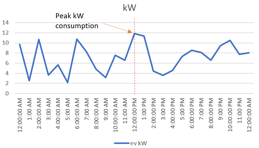 This metric represents power consumed by electric vehicle at the time of system peak for a user specified duration in kW.