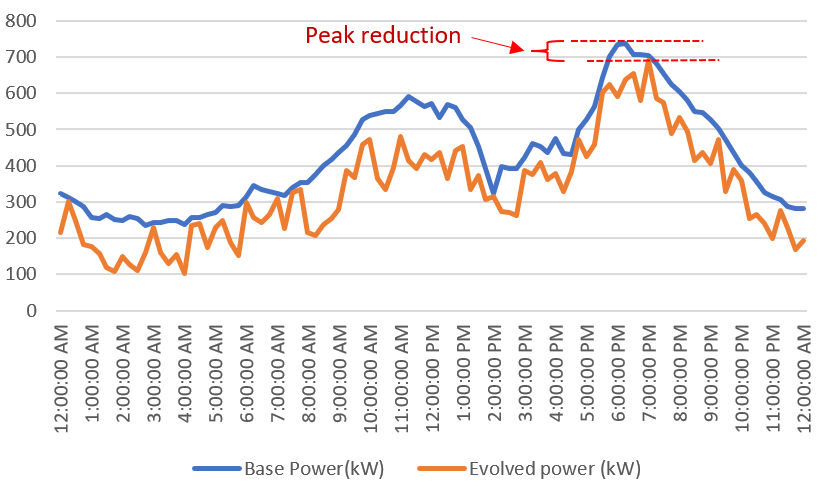 Peak reduction is percentage reduction in peak power in evolved (or new) load profile compared to base or reference profile.