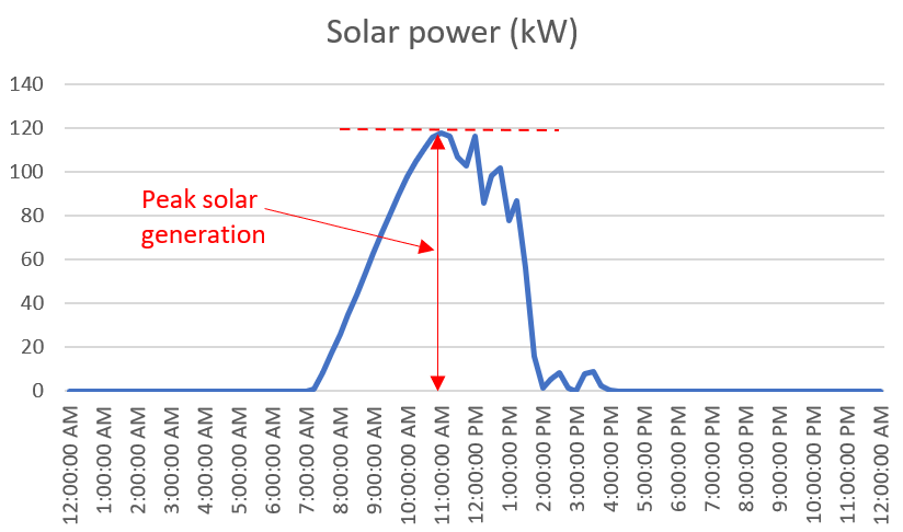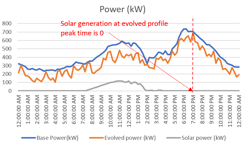 This metric represents solar power generation in kW at the time of evolved load profile peak time for a specified duration.