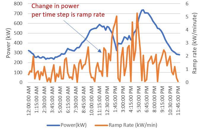 Maximum ramp rate in evolve dashboard represents absolute maximum change in power per hour. It's unit is MW/hr. Mathematically it is represented as below.