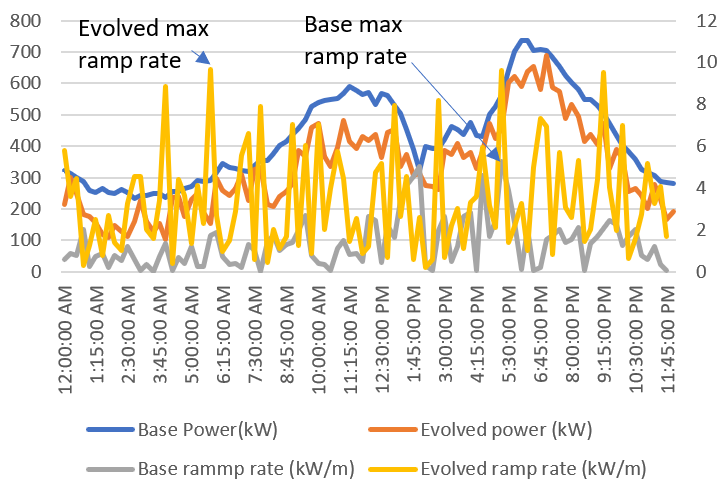 Ramp reduction is percentage reduction in maximum ramp rate of evolved (or new) load profile compared to base or reference profile.