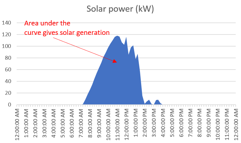 Solar energy generation is just a sum of solar power at all time steps in a given duration multiplied by resolution. Unit of solar energy generation expressed in EVOLVE is kWh.