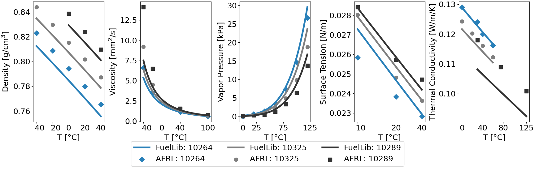 Fig. 2 Properties of conventional jet fuels JP-8 (POSF10264), Jet A (POSF10325), and JP-5 (POSF10289) against data from the Air Force Research Laboratory[5]. Note that the data sets for thermal conductivity are very inconsistent, but they typically show linear decreases in thermal conductivity with temperature.