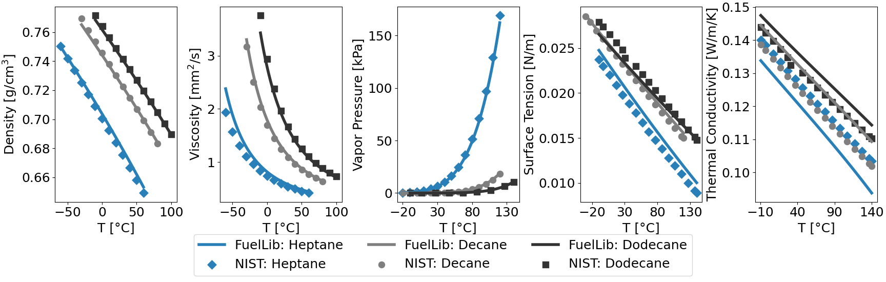 Fig. 1 Properties of heptane, decane, and dodecane against predictive data from NIST Chemistry WebBook.