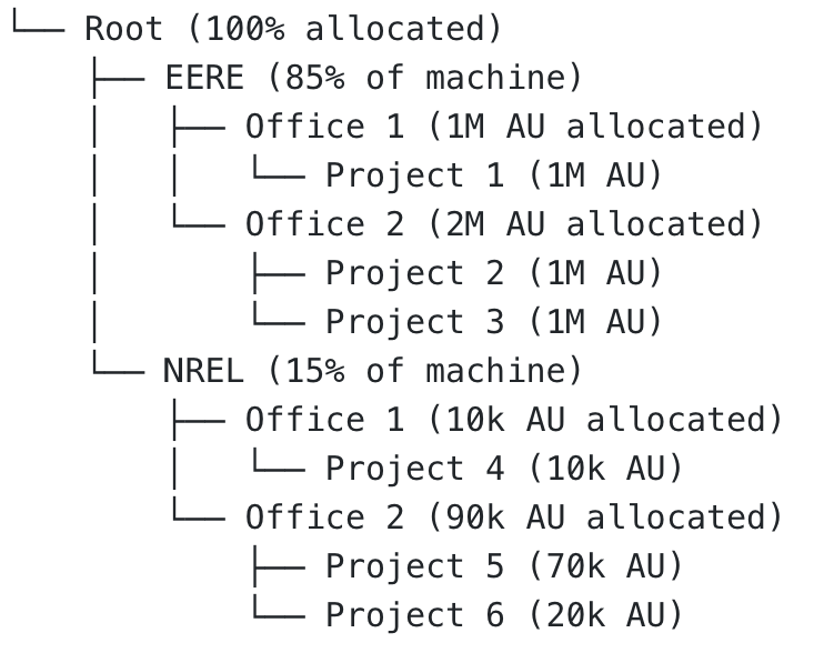The list is descended depth first in part to prioritize the higher level assigned percentages (e.g., the EERE and NLR utilization is balanced first, then individual offices within EERE and NLR, and so on). Due to the depth first traversal it is hypothetically possible that an underserved allocation exists with a high level fairshare value, but is lower on the ranked list as the order of traversal is determined from its siblings and parents' usage.