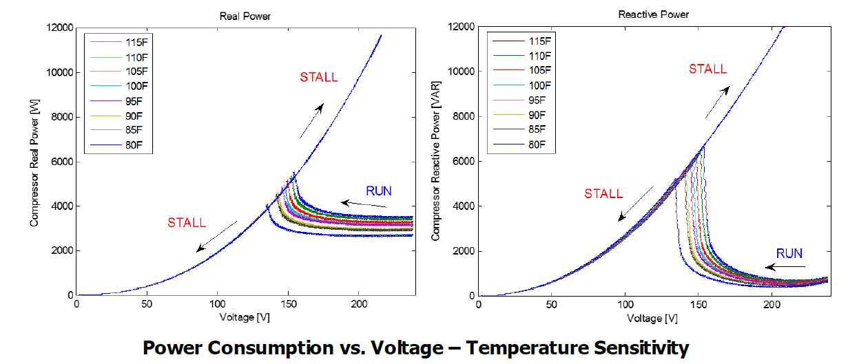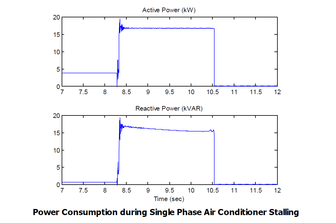 This controller implments the motor stall model for single phase motors (residential air conditioners) and models two states of operations i.e. run state and stall state. As supply voltage is decreased, the motor slowly begins to consume a higher amount of active and reactive power. At some voltage level (“stall voltage”), the supply voltage is no longer adequate to maintain stable motor operation and the motor “stalls” (stops). There is insufficient motor torque to overcome the load torque and therefore the motor stalls. Head pressure is built up in the compressor, so the motor is unable to reaccelerate until that pressure is reduced. At this point, the motor draws extremely high amounts of current particularly when the voltage recovers to normal operating level. This is because once the motor stops (stalls), its electrical behavior is essentially that of a resistive plus inductive load (i.e., a shunt reactor to ground). Ambient temperature also plays a clear role in stall characteristic.