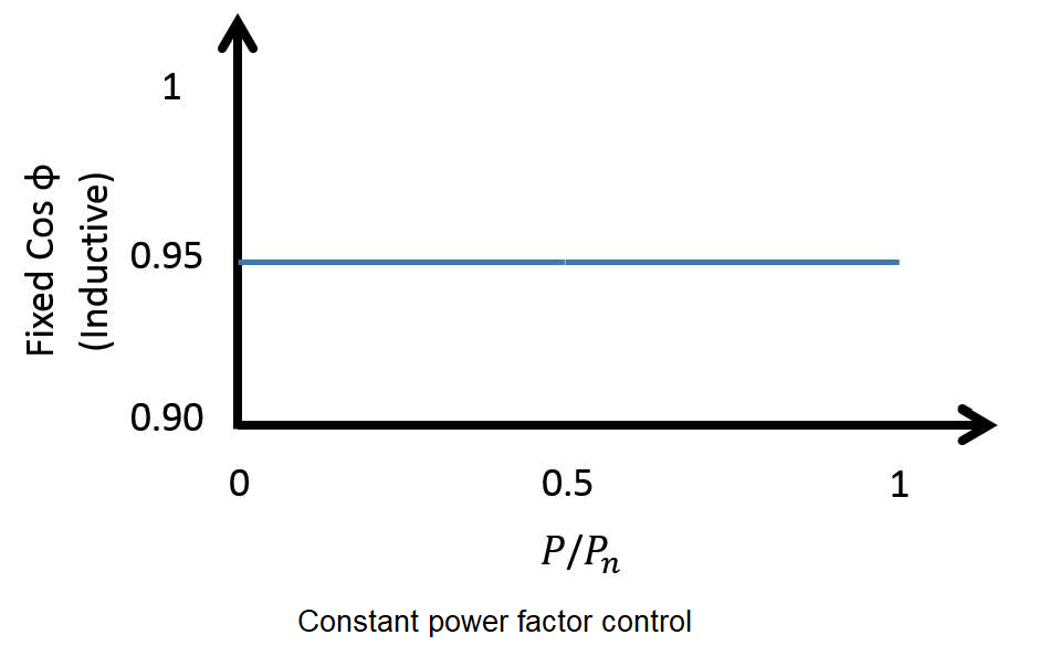 In constant power factor mode, inverter reactive power follows its active power output, thus ensuring power factor remains constant. Constant power factor control mode is cost effective as no additional components are required and is simple to implement. However, constant power factor control is an inherently inefficient compensation technique as reactive power is supplied not taking into consideration the current state of the network.
