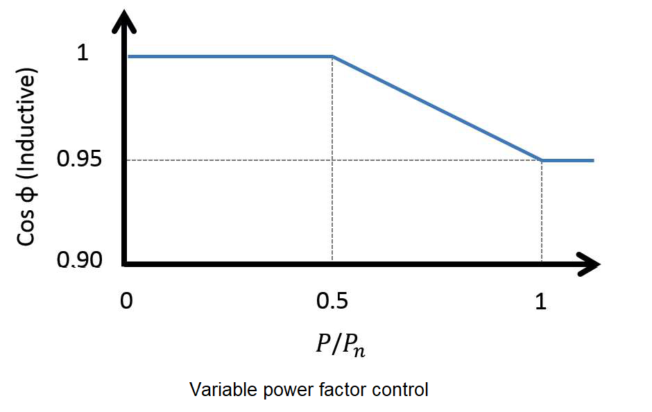 Variable power factor control is another reactive power compensation method implemented in this controller. The idea is to operate the inverter at unity power factor while output power is less than a preset fraction of the rated power of the inverter. Once power generation exceeds the preset limit, power factor decreases linearly as a function of inverter power output. At times of peak generation, power factor is at a minimum hence the reactive power supply is maximum. This method is much more efficient when compared with constant power factor mode.