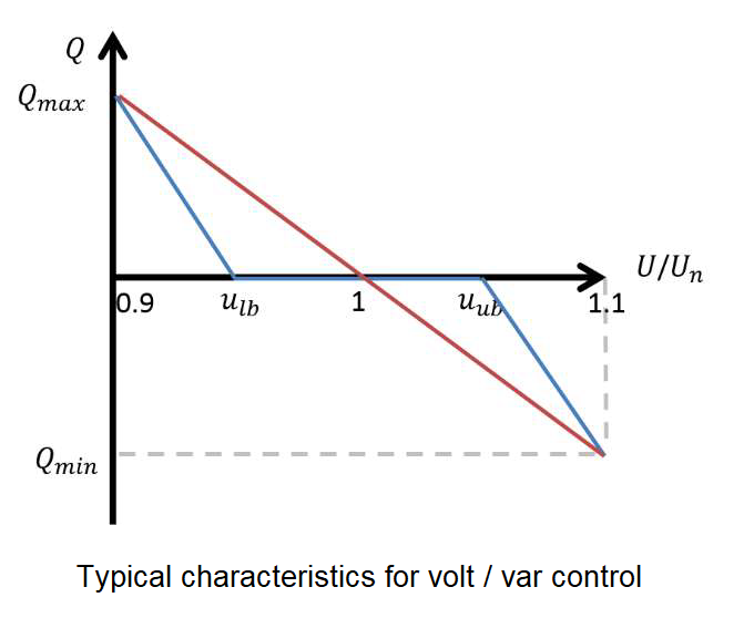 Droop based reactive power compensation also known as Volt/VAR control is another local reactive power compensation method that has been implmented in this controller implementation. In this control method the amount of reactive power an inverter will absorb or inject is dependent upon the voltage at the PCC. The contoller allows users to define different droop curves including linear, piece-wise linear and non-linear curves. The advantage of having a dead band in Volt/VAR droop characteristics is that, it minimizes unnecessary compensation when voltage is within the prescribed bounds. Volt/VAR droop control is more efficient in voltage regulation compared to variable power factor control.