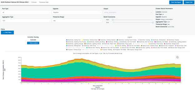 - Load Profiles: Timeseries energy and other results (individual building or pre-aggregated by geography) in downloadable spreadsheets.