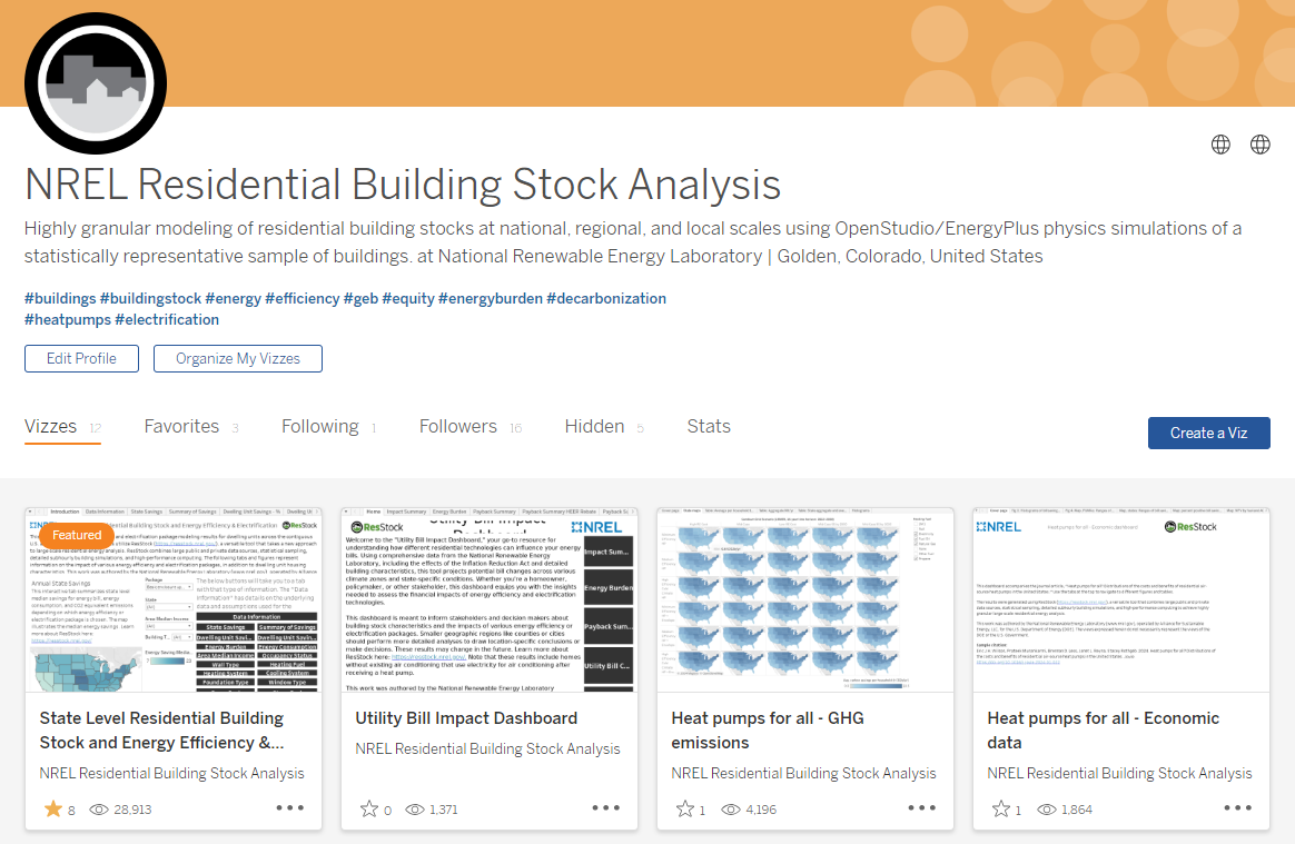 ResStock dashboards exist to give a more comprehensive overview of results in different ways, from housing characteristics, specific housing upgrade scenarios, or even focusing on a specific topic like heat pumps. This platform is available at public.tableau.com/app/profile/nrel.buildingstock/vizzes. Multiple geographic views of the datasets on the dashboards have been created: by state, by Building America Climate Zone, and by AHSRAE/IECC Climate Zone.