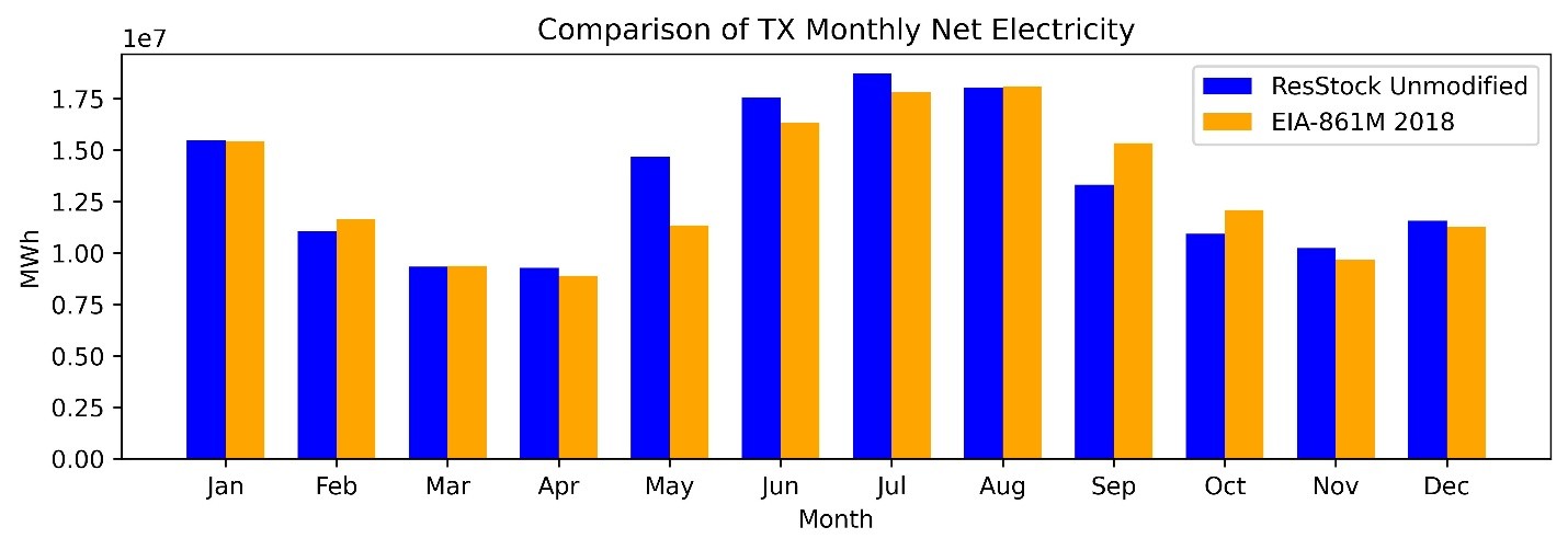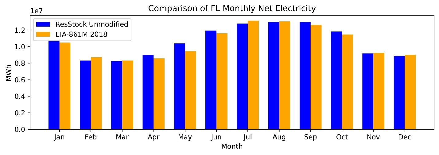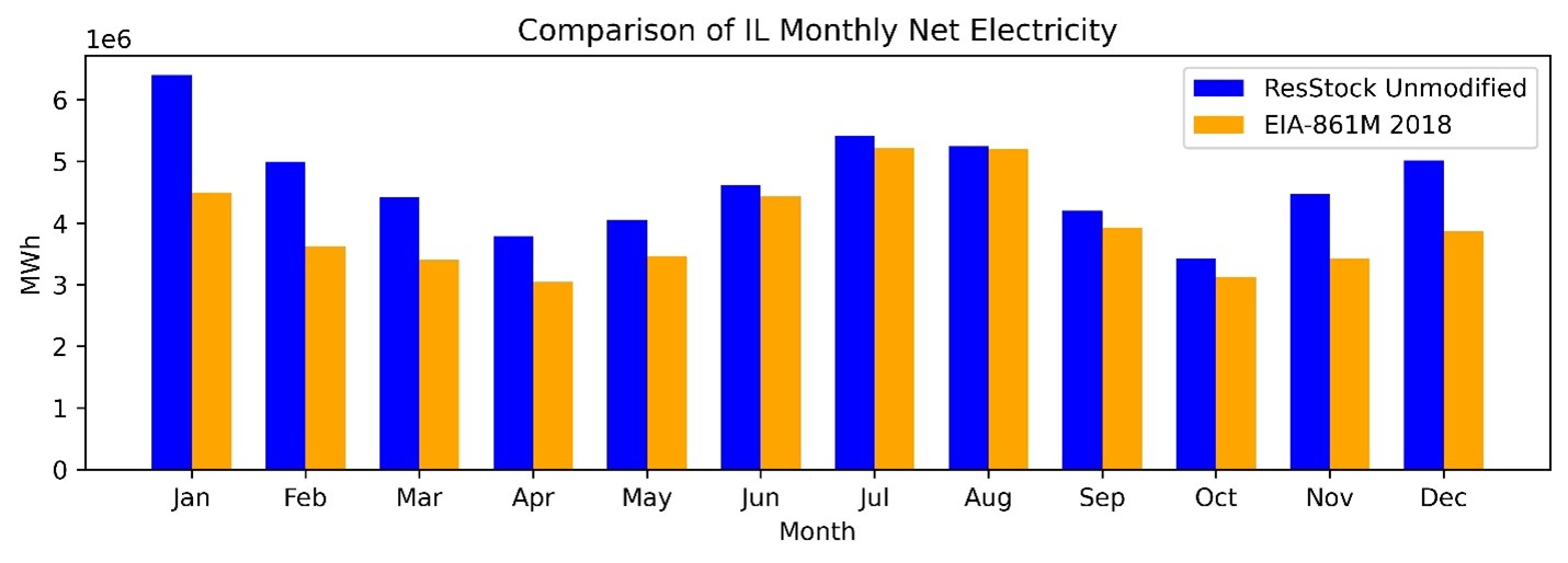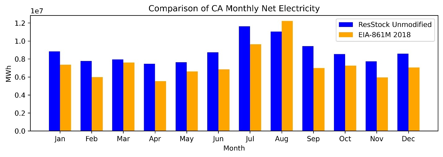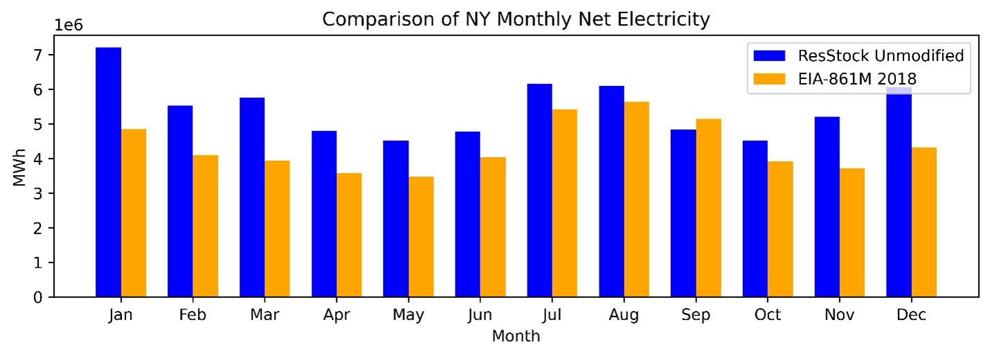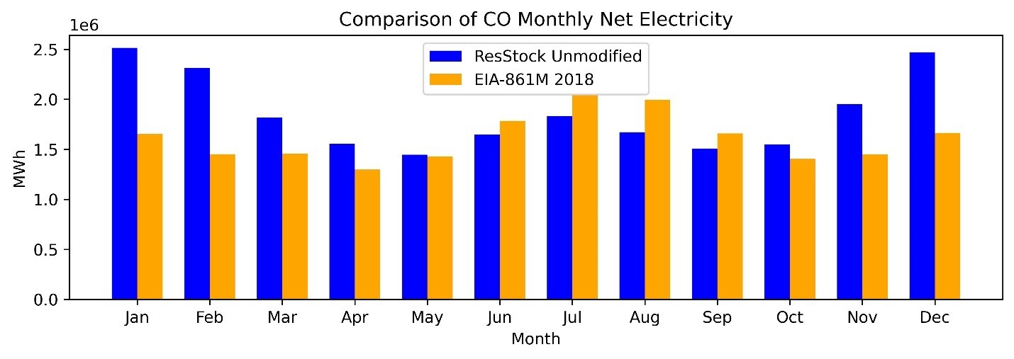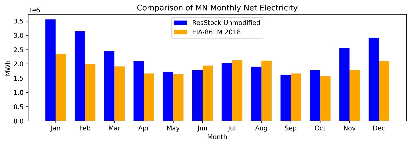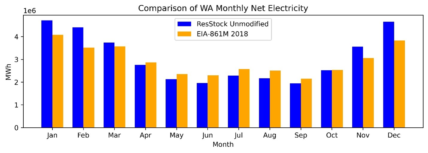 Some of this difference may be attributed to ResStock data alignment with the calendar months because it is a simulation, whereas the EIA data may not exactly align. There may be differences in how utilities report data, whether on a calendar monthly basis or a billing period within a month for example. Therefore, reported and actual consumption within a calendar month may not be the same. However, the magnitude of the monthly differences in some cases is large enough that not all of the difference could be due to reporting.