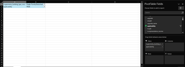 The models that have been upgraded, or homes that were eligible to receive the cold-climate heat pump with the electric backup, can be identified by the applicability column. Drag applicability from the list of fields to the Filters box, like we did with in.geometry_building_type_recs, and from the down arrow next to the it, choose True. The table now looks like this.