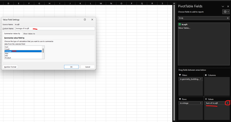 To answer our first question, the column or the field we need to add to the PivotTable is in.sqft . In the list of fields, choose in.sqft and drag it to the Values box. Choose the down arrow next to the box, and choose Value Field Settings. When the pop-up window appears, choose Average instead of Sum so we can understand the average size of home per vintage.