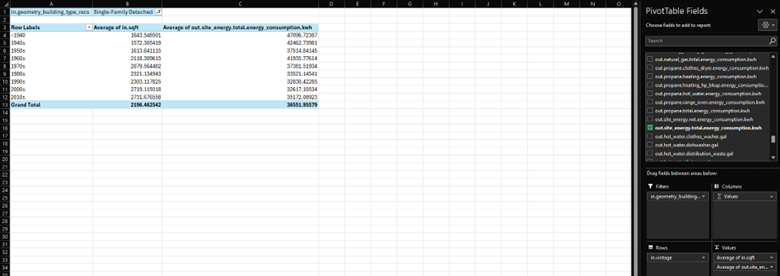 The next task is to determine the average energy consumption of homes through different vintages. In the fields list, choose out.site_energy.total.energy_consumption.kwh and drag it to the Values. Click the down arrow and choose Value Field Settings like we did in the previous step. Choose Average instead of Count and click OK. The table now shows the average size and energy consumption of the homes over time.