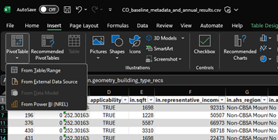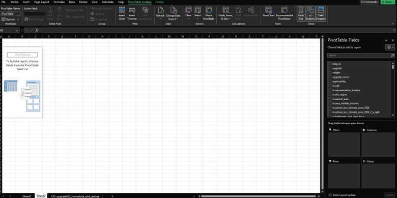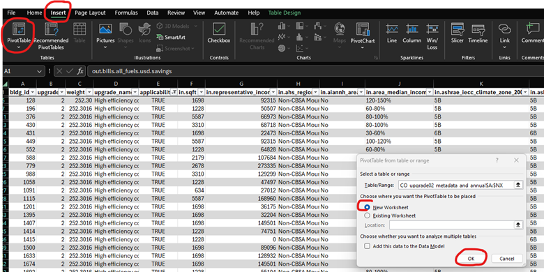 Then, for the natural gas bills on the data dictionary, we have one option out.bills.natural_gas.usd, but we want to know the savings, not just the total bills. Look back at the CO_upgrade02_metadata_and_annual_results file, and search for “out.bills.natural_gas”. There are actually two listings, one is out.bills.natural_gas, and the other is out.bills.natural_gas.usd.savings, which is what we actually want. Therefore, let’s use the out.bills.natural_gas.usd.savings. We’ll use Excel and PivotTable to answer the questions about the upgrade information too. As a first step, insert a new PivotTable following the same steps as the baseline housing.