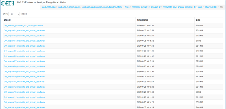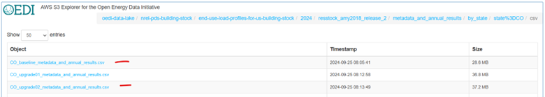 If you go into the metadata_and_annual_results folder, the data is available at two scales and in two file formats. Metadata refers to the housing characteristics of the dwelling samples, while annual results are annually aggregated metrics from the simulations. The baseline file contains housing metadata as well as the energy baseline, while the upgrade files contain the energy consumption and resulting metrics post-upgrade, upgrade savings, and housing metadata from the baseline. Below is a screenshot of the file structure showing an example of this for Colorado.