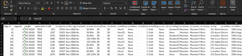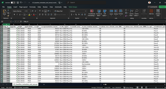 The second row shows a field_name called applicability with a field_description of: The measure was or was not applied to bldg_id. This is what we are looking for. Going back to the CO_upgrade02_metadata_and_annual_results file, search for the applicability column, and make sure only TRUE is chosen as an option. That means only the samples that were actually upgraded with our package of interest, high-efficiency cold-climate air-to-air heat pump with electric backup, will be shown. If the value is FALSE, that means the building sample was not upgraded with this package.