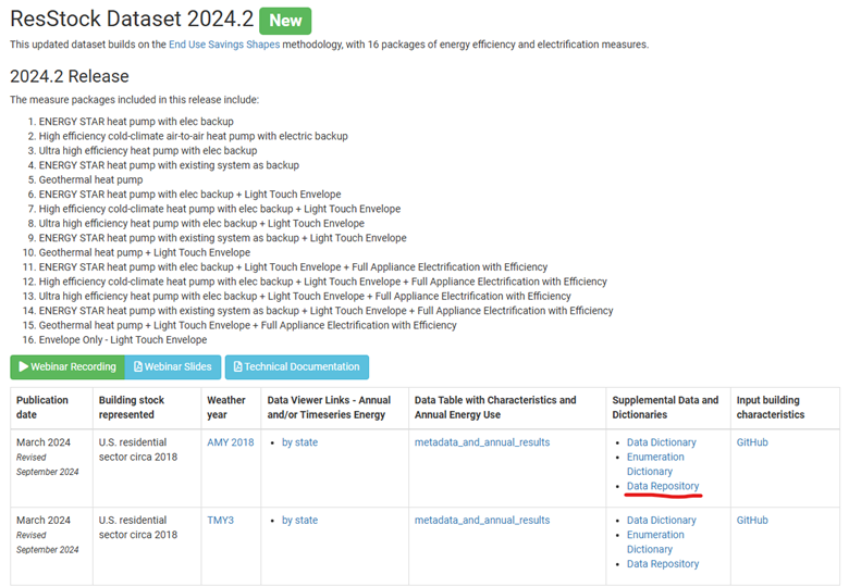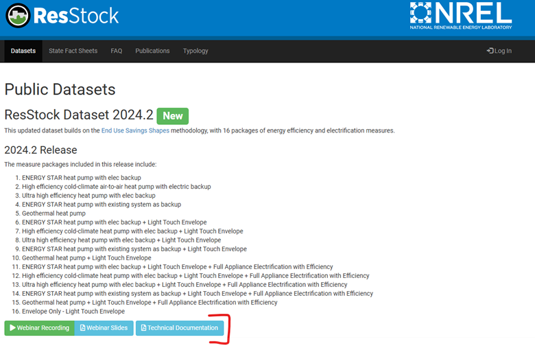 ResStock publishes national level datasets containing the energy baseline and a set of energy efficiency measures on the Open Energy Data Initiative (OEDI) website. The documentation for each release is on our website, and near each release you will see a Technical Documentation button. We recommend browsing the documentations so that you can choose the dataset that can best answer your questions. The datasets can vary in the type of housing upgrades, weather years, model assumptions, reporting metrics, and more. Below is a screenshot showing an example of where our documentation is located for our 2024.2 dataset.