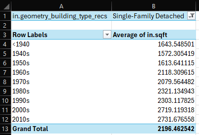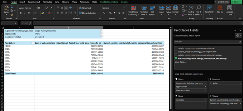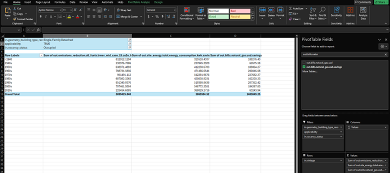 Now you have seen examples of how to use PivotTable and answer potential questions about how an upgrade would impact a portion of the housing stock. In general, these are just a few questions that can be answered using the baseline housing results and the upgrade results. If you have more questions about how ResStock could be used for your residential building stock analysis, check out the Contact page.