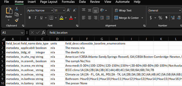 Reading through the data_dictionary.tsv Column B, field_name, row 63 has in.geometry_building_type_recs with a field description of “PUMS 2019 building type”, and allowable_baseline_enumerations of “Mobile Home”, “Multi-Family with 2–4 Units”,” Multifamily with 5+ Units”, “Single-Family Attached”, and “Single-Family Detached”. This is the column we need to filter the baseline and upgrade files to only see results for Single-Family Detached homes.