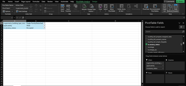 When describing the housing segment, it may be useful to exclude vacant units, or separate them into their own subsegment, as they have very low energy usage and may skew the average values. Vacant homes only have energy consumption from baseloads, like refrigerators and freezers, and some heating loads to prevent frozen pipes. For this example, we will exclude vacant homes. Looking back at the data_dictionary.tsv, we see that line 173 has a field called in.vacancy_status that describes if there are occupants in the home or not. Go back to the PivotTable, and drag in.vacancy_status to the Filters box just like we did for the other two filters, and choose Occupied. All three filters together now look like this.