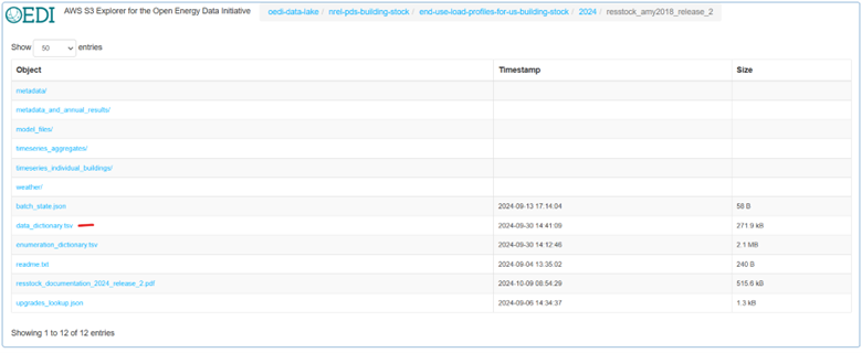 To get to the 2024.2 dataset, visit the ResStock website, and go to the Datasets tab. Under the name of each release is a table of information about the release. In the Supplemental Data and Dictionaries column, there is a link for the Data Repository of each dataset. This is how to reach the data on OEDI. Clicking on the Data Repository link for this dataset shows the following: