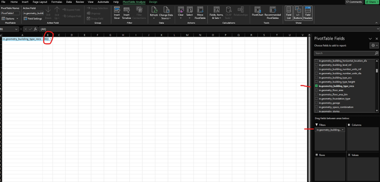 We want to look at the questions by Single-Family Detached homes only, so let’s start with that first filter. In the fields table, click and drag in.geometry_building_type_recs into the Filters box. Then, where it says (All), we need to only select Single-Family Detached.