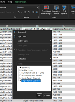 Then, search for the column name we need to filter: in.geometry_building_type_recs. Turns out it is column BK. Click the down arrow in the column, and make sure Single-Family Detached is the only housing option selected. Click OK to apply the filter.