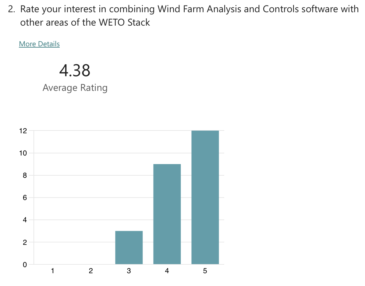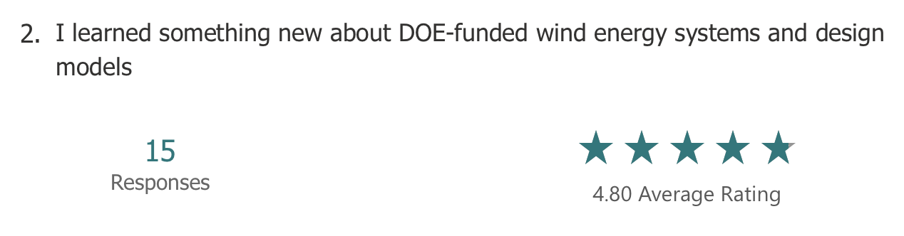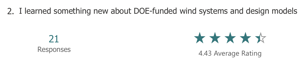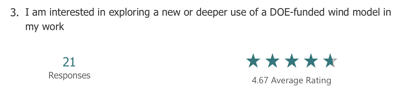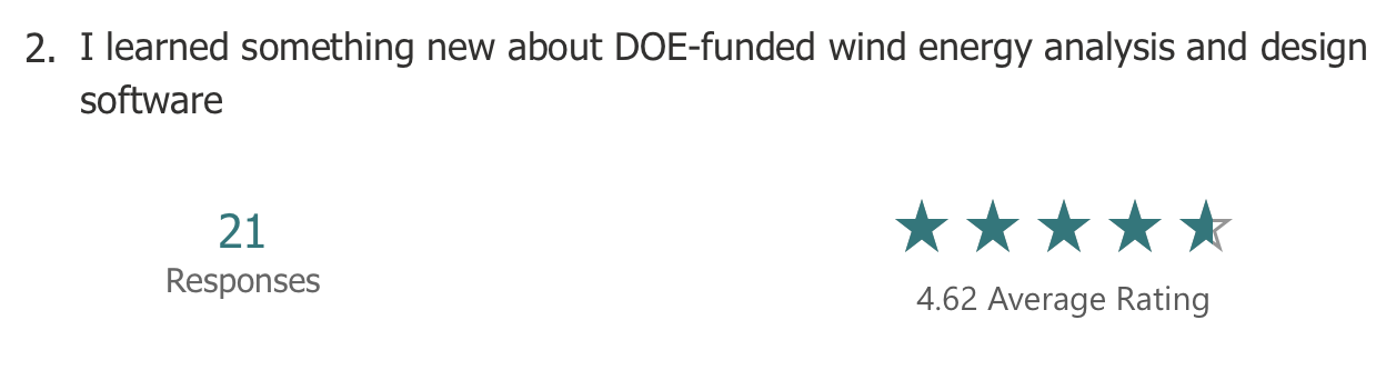 The anonymous feedback included more detailed suggestions. In general, there was an appreciation for the big picture overview of the WETO Software Stack. Respondents also noted that it was helpful to hear about the future roadmap from the model owners directly. The redundancy across workshops was called out as a negative, and many comments suggested to hold workshops for specific software.