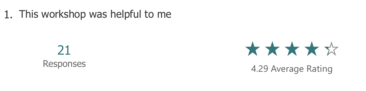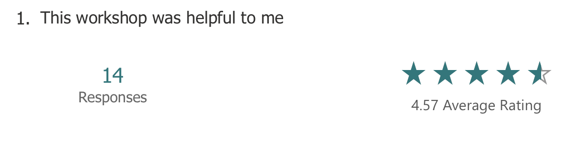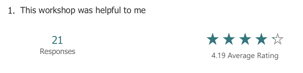 Attendees were asked to rate the workshops on a scale of 1 to 5 at the end of each workshop, and a follow up email was sent including an opportunity to provide anonymous feedback. The feedback was generally positive and each workshop received a rating of 4 or higher out of 5. The questions and responses are given below.