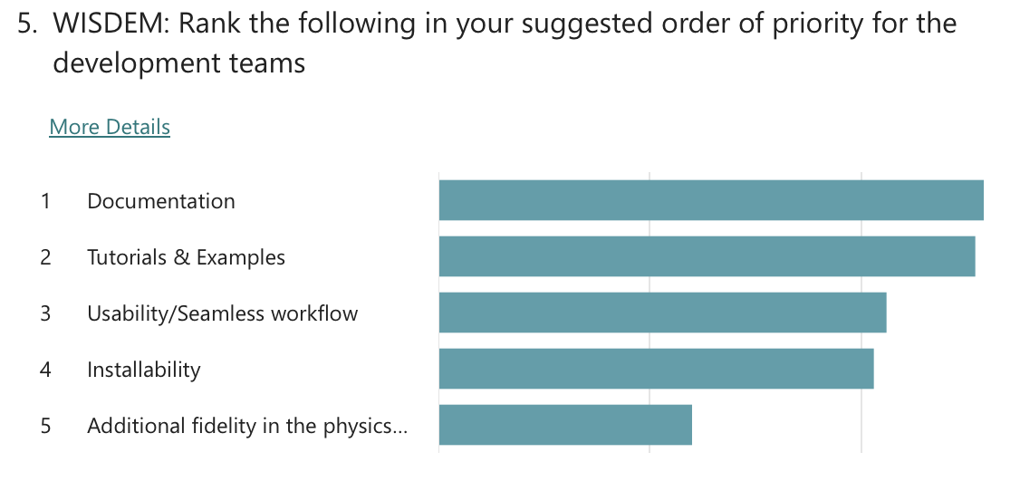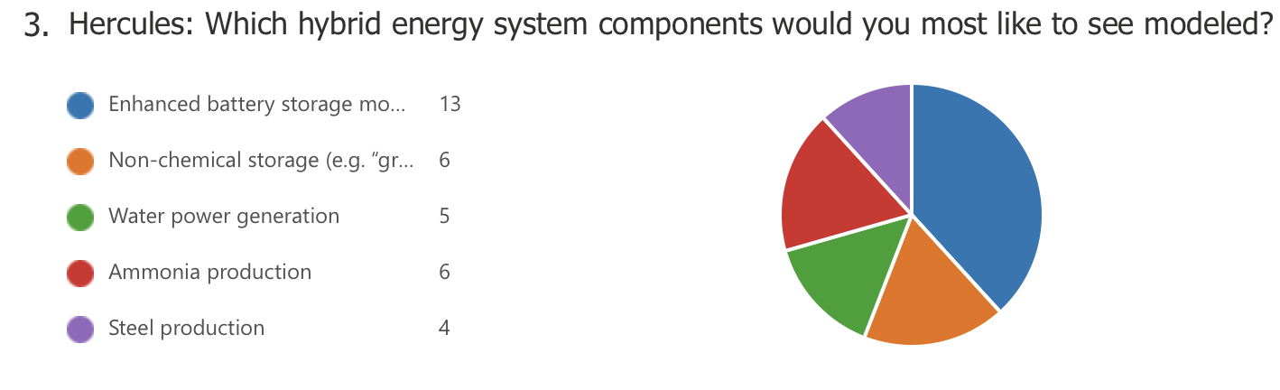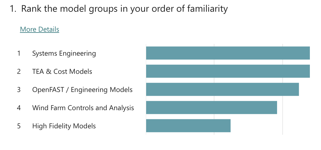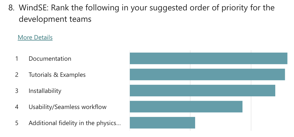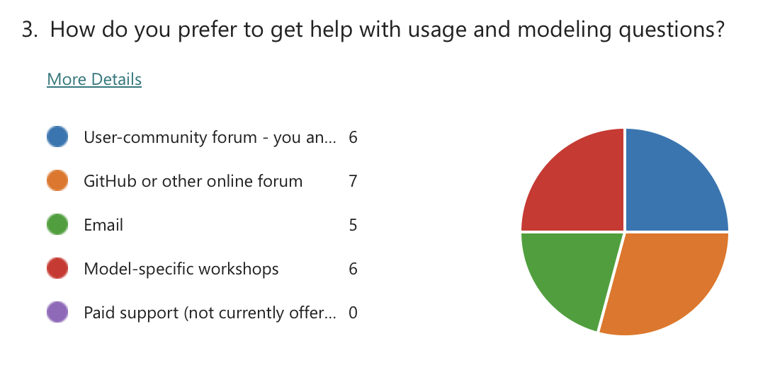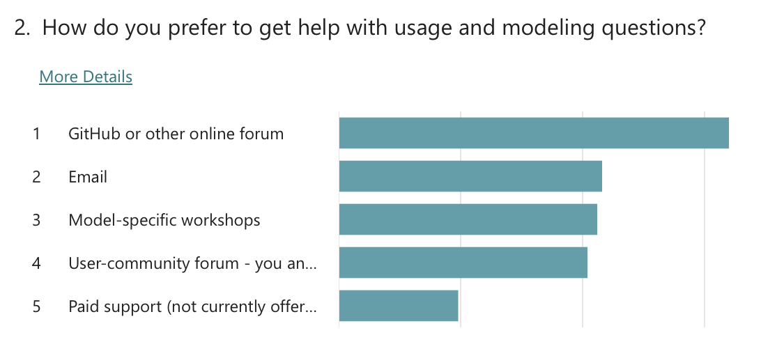 In each workshop, questions were asked about existing and future user support options. As for existing support, attendees noted that they mostly receive help from the model owners via the NREL Forums and GitHub-based forums, and that they also use the documentation and examples as a reference. On future user support, the questions asked attendees to rank support options in order of priority. The questions in each workshop were different, so a direct comparison is not made. However, respondents generally settled on the following ranking: